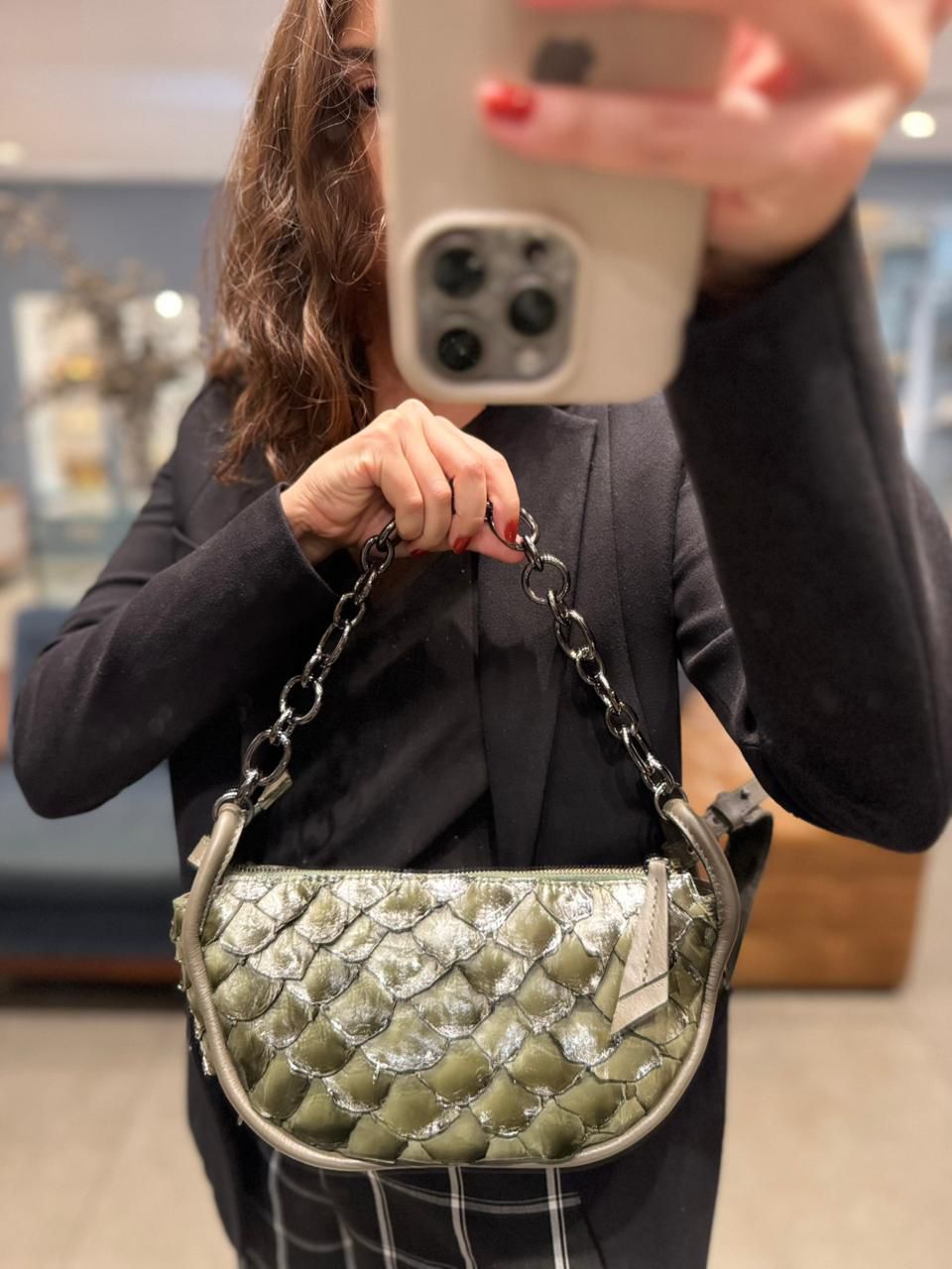 A Bolsa Meia Lua Pirarucu na cor Militar combina design contemporâneo e sofisticação natural em uma peça única e marcante. Seu formato meia lua traz um visual moderno e elegante, enquanto a textura autêntica das escamas de pirarucu adiciona exclusividade e personalidade ao acessório. A tonalidade Militar, em um verde profundo e sofisticado, valoriza ainda mais os detalhes da peça e destaca sua riqueza de acabamento, criando um efeito visual elegante, versátil e atemporal.