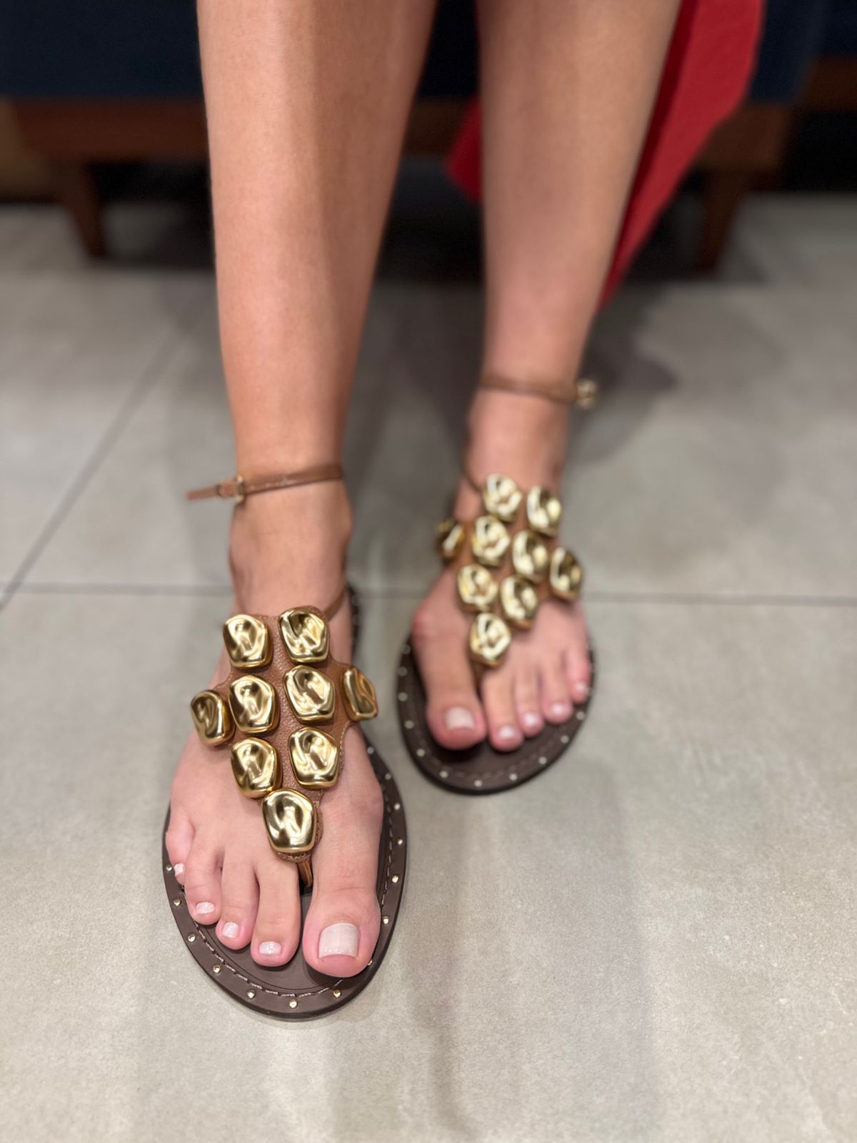 A Sandália Dedo com Detalhes Dourados traz um design marcante e elegante, ideal para quem busca um visual moderno e cheio de personalidade. O modelo possui aplique de peças metálicas douradas na tira central, criando um efeito luxuoso que valoriza o pé e transforma qualquer produção. O solado em tom escuro, com pequenas aplicações metálicas ao redor, adiciona ainda mais estilo, garantindo firmeza e conforto ao caminhar. A tira que envolve o tornozelo oferece ajuste seguro e delicado, completando o visual com um toque de refinamento.