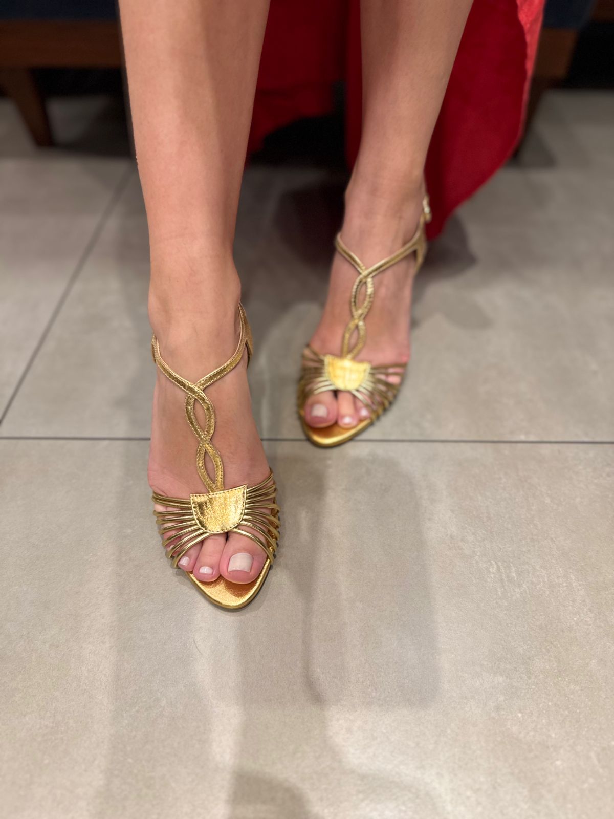 A Sandália Salto Médio Tiras na elegante cor Ouro. Seu design moderno conta com tiras delicadas que abraçam os pés, valorizando o visual com um toque de brilho luxuoso. O salto médio oferece estabilidade e elegância, ideal para quem busca estilo em ocasiões especiais ou no dia a dia.
