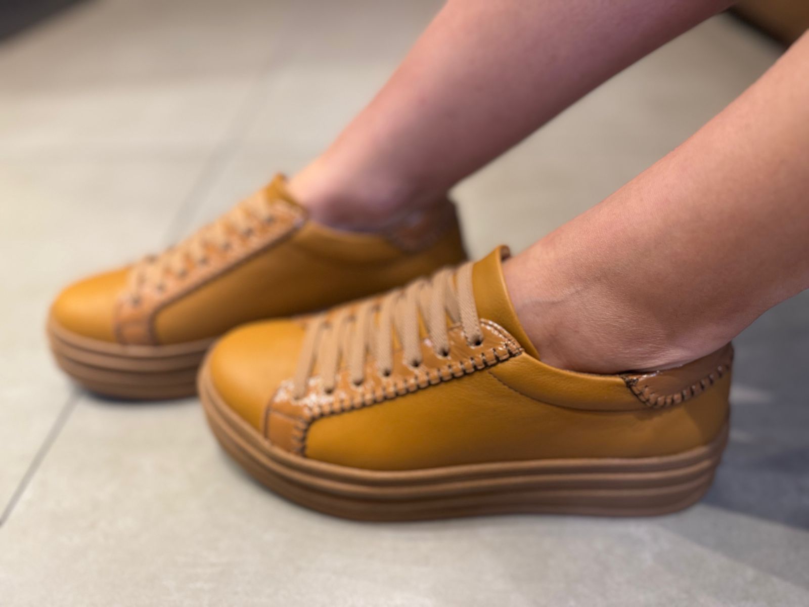 O Tênis Flatform com Detalhes em Verniz Caramelo é a união perfeita entre conforto e estilo. Com design moderno e solado flatform que garante estabilidade e um toque de atitude, o modelo se destaca pelos detalhes em verniz que acrescentam brilho e sofisticação. A cor caramelo traz versatilidade e elegância, combinando facilmente com produções casuais ou urbanas. Leve, confortável e cheio de personalidade.